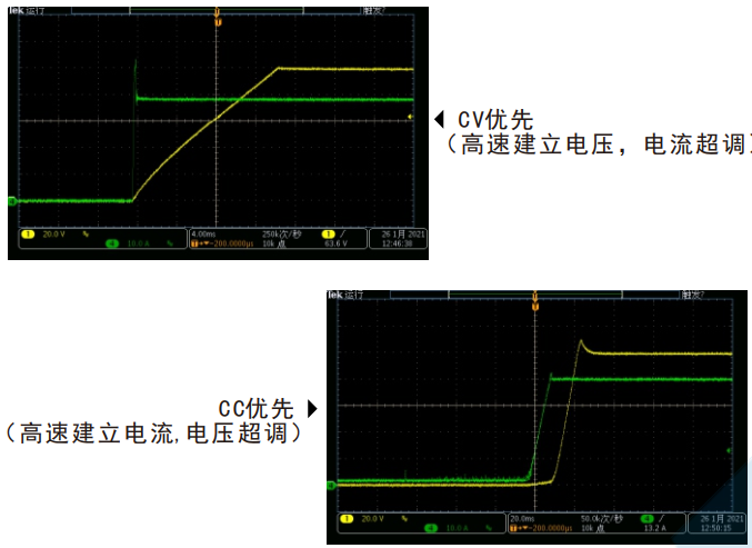 FTB9000 系列設備具有CV、CC、CP 輸出模式,足以應對市場的普遍需求。而在面對更嚴格的應用領域,滿足客戶的特殊要求,FTB9000 系列設備提供了CV 優先、CC 優先以及關閉優先選項,CV 優先、CC 優先能使設備在開啟瞬間強制運行在CC 模式或CV 模式。以避免由于用戶采用容性或感性負載時造成的電流或電壓尖峰。