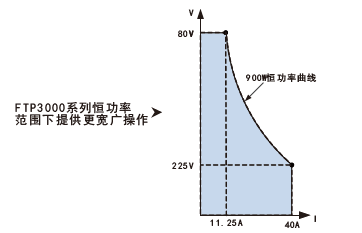 FTP3000系列擁有超過3.5倍寬范圍輸出量程,支持恒功率輸出功能。輸出開啟后, 電源不斷調整輸出電壓或輸出電流,使輸出功率維持恒定。若負載超出電源的調節范圍,輸出將維持在最大設定值。(注意:恒功率輸出功能主要應用于響應速度10ms以上的負載。)