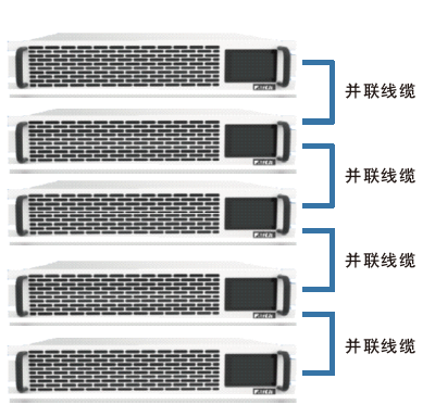 FTDM系列采用先進控制算法實現多機并聯,并機系統功率等級可覆蓋1MW,大大擴展了電源的應用輸出范圍。并機功能除了使電源之間自動均載,保持輸出值的一致,還保證了輸出斜率曲線或者波形的一致。處于并聯狀態的主機,電源屏幕顯示的是總電壓、電流和功率值。每路從機自主均流,自動求和。