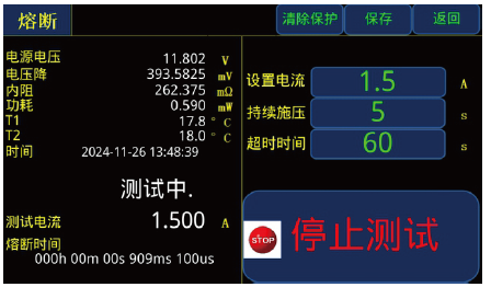 電流梯度測試,每間隔一定時(shí)間遞增起始電流的10%,測試過程產(chǎn)品熔斷,會(huì)顯示“熔斷”并給出顯示提示,遞增至2.5倍電流產(chǎn)品不熔斷則顯示“測試完成”。時(shí)間間隔范圍為:0.01s-3600s。